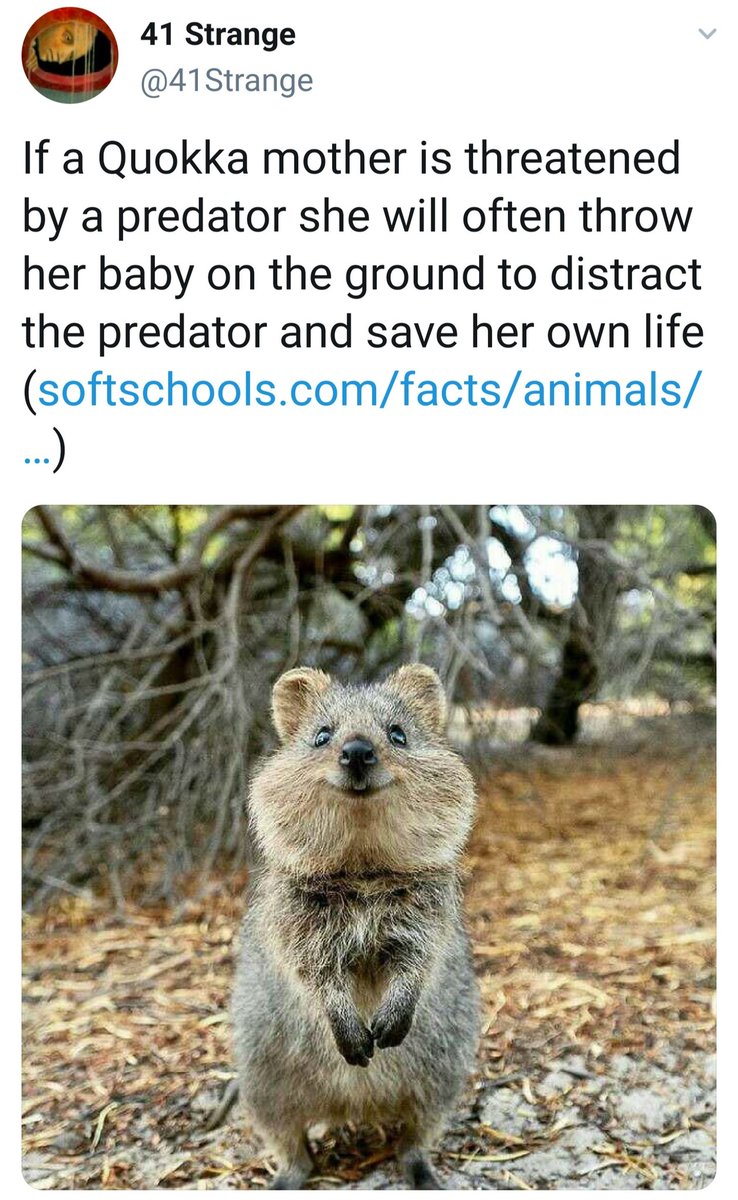 The baby lives with the mother for several months and at a year they are ready to mate. This statement originated in June of 2018 when Sad Animal Facts shared a meme on Twitter with the caption. The Quokka baby throw tossing babies at predators.